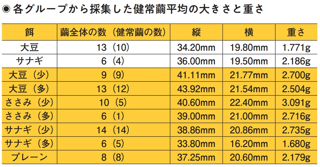 7つのグループには餌に応じて、大豆(多)、大豆(少)、ささみ(多)、ささみ(少)、サナギ(多)、サナギ(少)、プレーンと名をつける。(多)はたんぱく質が2倍量、プレーンはシルクメイトだけを与えるグループだ。
