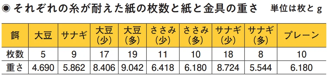 糸の強度は、次のように調べた。各グループからなるべく上質な繭を選び、沸騰した湯に繭を沈めてほぐし、1500m近くある糸を巻き取る。巻いた糸から太さが均一な1本をほぐし取り、鍋の直径部分に渡しかけて固定する。糸に暗記用のリングメモをぶら下げ、糸が切れるまで紙の枚数を増やした。結果は上の表のとおり、たんぱく質摂取量の増加で糸が強くなることが確認できた。