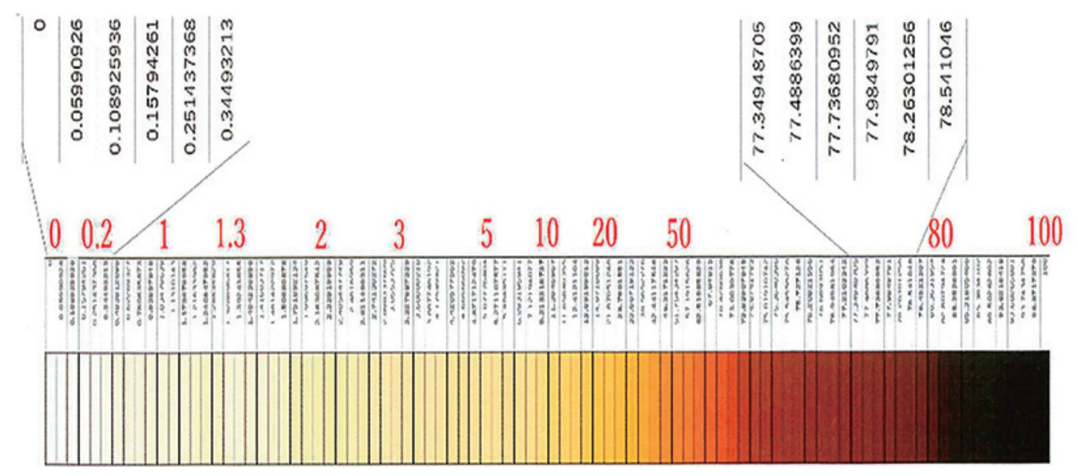 完成した90色を、分光色差計で3回以上測定した。ソフトウエアを使い色ごとに、色の濃さの指標であるK/S値(450nm=褐色成分が光を吸収する波長)の平均値を出す。糖化の反応開始時を0、終了時を100として、K/S値の相対値を90色分求めた。こうして完成したのが、下のAGEスケールだ。