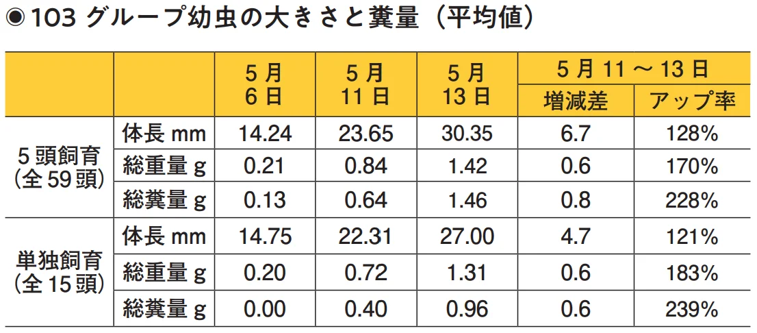 前回の実験では「比較的サイズの大きい幼虫」と、それより免疫力のない「体長8mm以下の小さな幼虫」に分け、比較観察を行った。今回、103グループは「比較的サイズの大きい幼虫」の担当として、ある程度のサイズになってから飼育カップへ移し、体長や重量などを測定する。確認した103個の卵のうち、孵化に成功した幼虫は74頭だった。そのうち15頭は1頭のみ単独で、残りは5頭ずつ飼育カップに入れ、5月6日から体長、重量、糞量の測定を開始した。