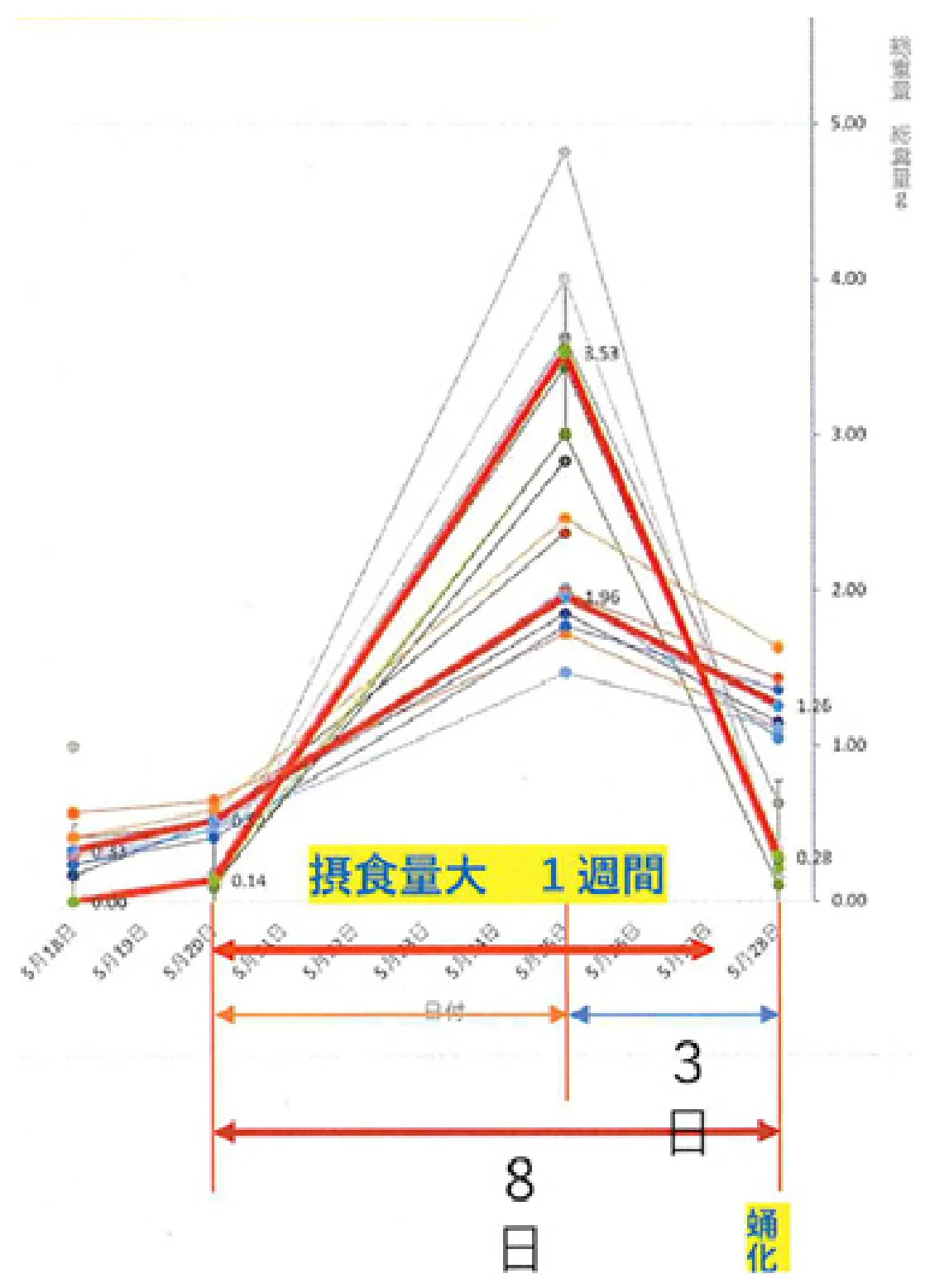 183グループでは5月28日に蛹化した8頭のみを対象に、5月18日、20日、25日、28日の平均データをグラフにした。すると、幼虫の蛹化までの急成長勾配がよりはっきりした。蛹化の3日前、25日が総糞量の最大ピーク時で、自分の体重の1.8倍の糞をしている。25日の糞量は20日の25倍、アップ率は2569%だ。食欲旺盛度に限度がなく、蛹化の1週間前にはウマノスズクサを限りなく用意する必要がある。幼虫は前蛹になる直前、おしりから不要物を排泄する(ガットパージ)ため、25日のピークをすぎると成長線は下降する。成長直線が急角度に上がる起点となっている20日から、爆食いが続いたのは1週間程度だろうか。実際の幼虫を見ていてもいきなり摂食行動をやめて、あたりを動き回って納得がいく頃合いに不要物を排泄、前蛹になる。