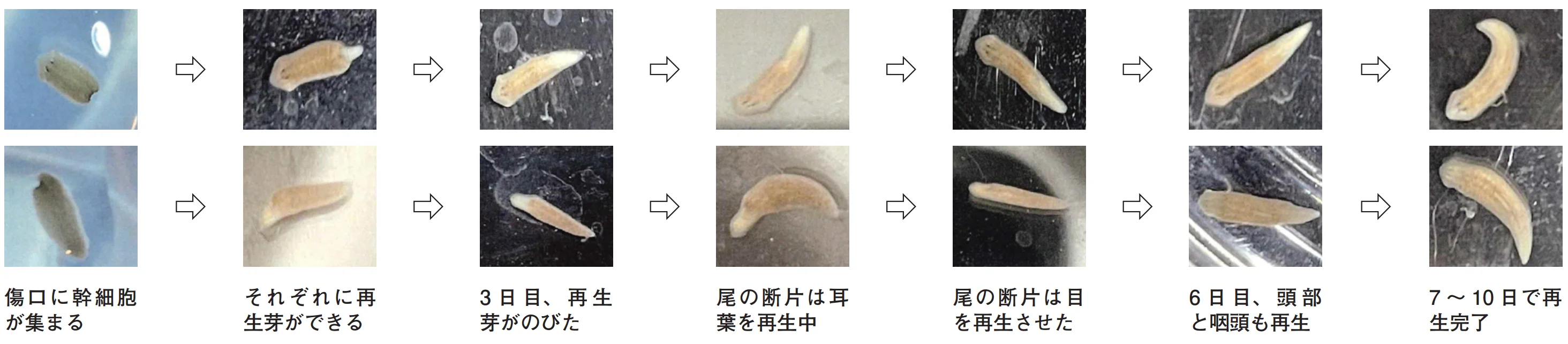 プラナリアは、自切と呼ばれる無性生殖をする。自分で体をちぎり、ちぎれた断片がそれぞれの個体へと再生する。自切ではまず、体の一部が細くくびれる。体の中央よりやや尾側がくびれることが多い。次に頭と尾に分かれるが、最後は自らの消化液で切り離す。自切後の断面は滑らかで、人工的に切断した場合(断面が整わず体液が多くもれる)とは違う。前後に分かれた頭部と尾部はそれぞれ新しい尾部と頭部をつくって、7〜10日前後に再生する。頭部も尾部も、再生の途中で動き始める。今回の観察では、尾部から頭部をつくって再生するほうが日数がかかった。頭部の脳神経や感覚器官を再生するのに、時間がかかったと考えられる。
