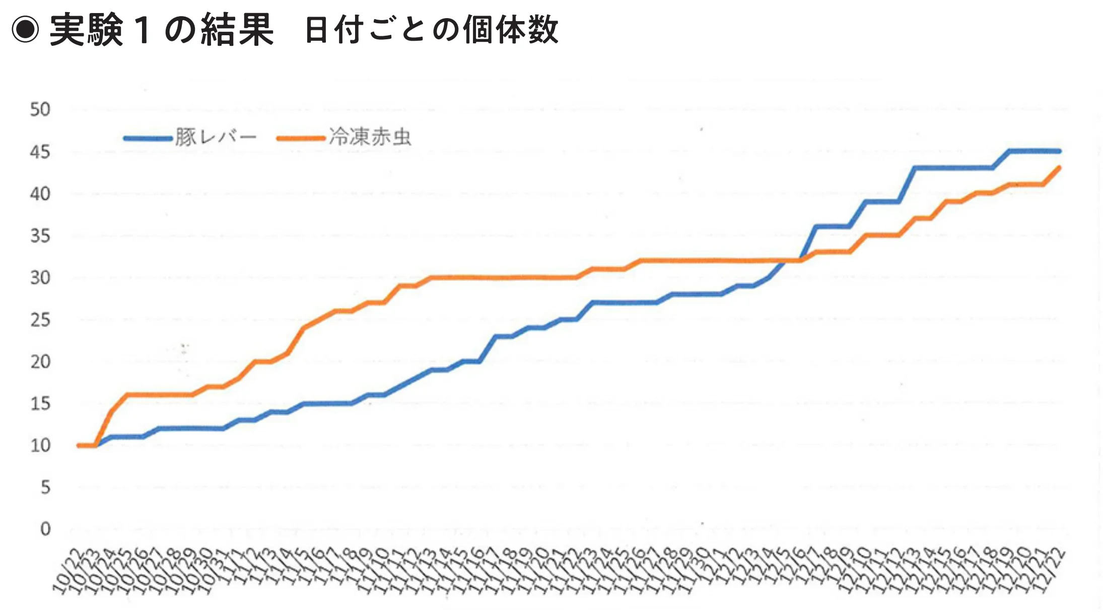 実験の結果は、上のグラフのとおりだ。自切の回数は予想とは違い、豚レバー群のほうが多かった。11月下旬までは赤虫群のほうが多く自切していたが、12月に入ると豚レバー群の自切が増加した。12月22日の最終日までに豚レバー群が10匹から45匹、赤虫群が10匹から43匹に増えていた。