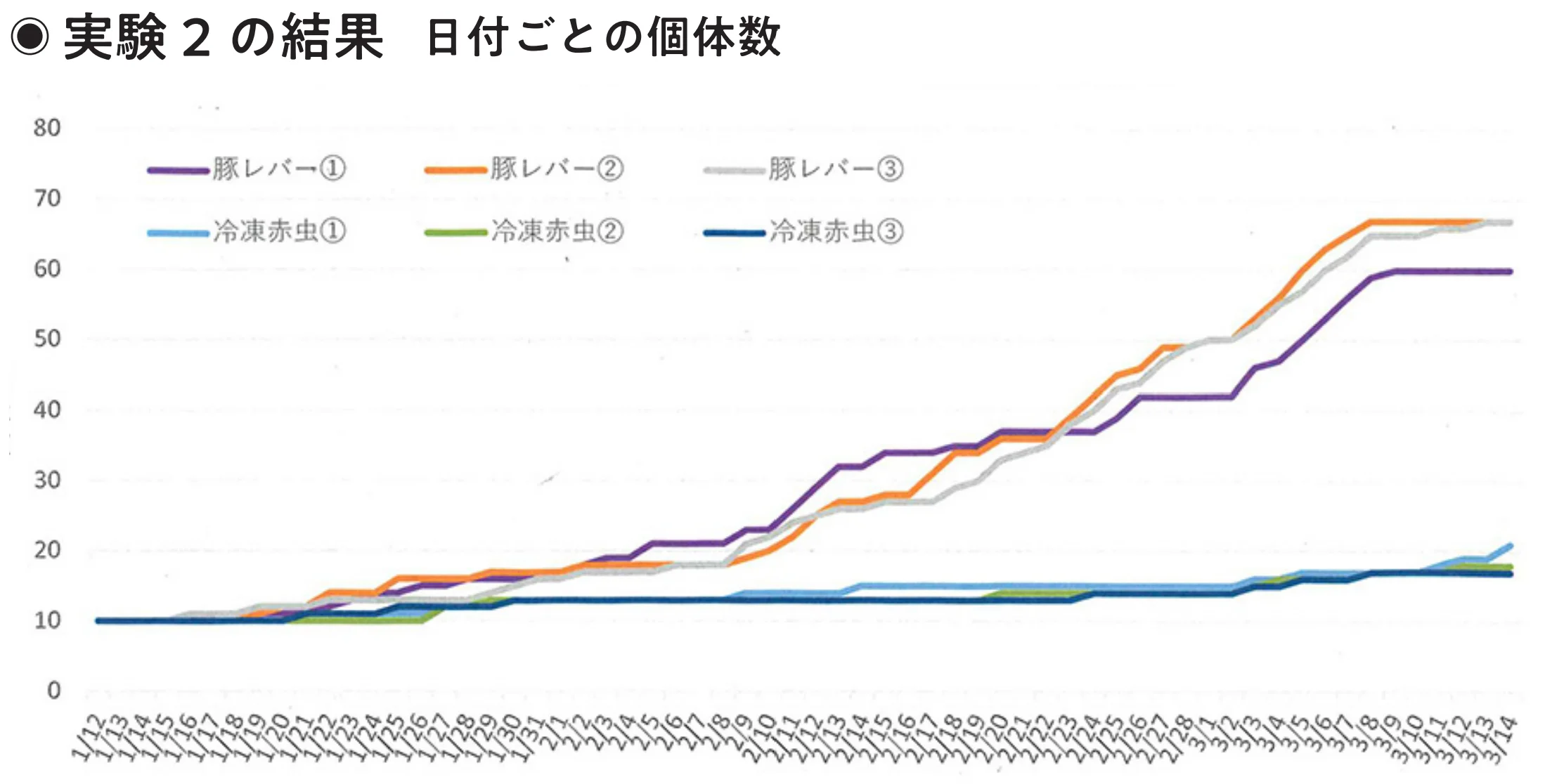 実験1と同じプラナリアを使い、同じ方法で行うが、最初の個体数を60匹へ増やした。30匹ずつ2群に分け、各群10匹ずつ3つのシャーレを用意、合計6つのシャーレで観察した。観察期間は2025年1月12日から3月14日までだ。実験1と同じように、最終的には豚レバー群が多く増えると予想した。観察の終わりには、1シャーレ50〜60匹になると期待する。