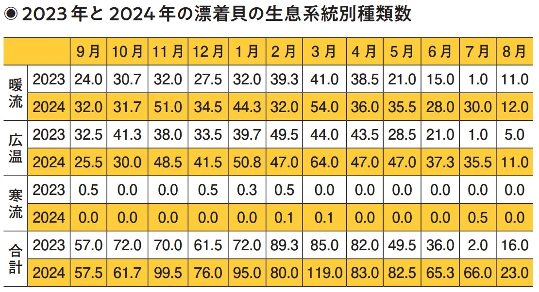 拾った貝の種類の数をまとめたのが下の表だ。まず系統にこだわらず拾った貝の合計を見ると、2023年は9〜10月に増えて、風の強い12月ごろに少し減り、年が明けるとまた増えている。これが続けてきた貝拾いの季節感で、違和感がない。2024年は拾える貝の種類は全体的に増えたが、季節感がなくなった印象だった。