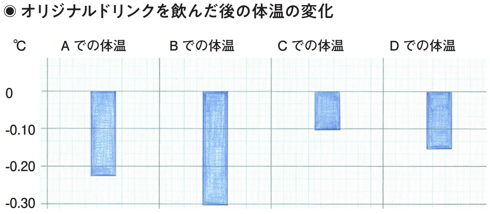 どの飲み物も飲んですぐに体温が下がり、特に2度目の100mlを飲んでから10分後のBで最も下がっている。が、時間が経過したDでは、実験前より逆に体温が上がった飲み物と、下げ幅は減るものの下がったままの飲み物に分かれた。Dの体温から元の体温を引いた値が低いほど、体をクールダウンさせる飲み物と定義した。