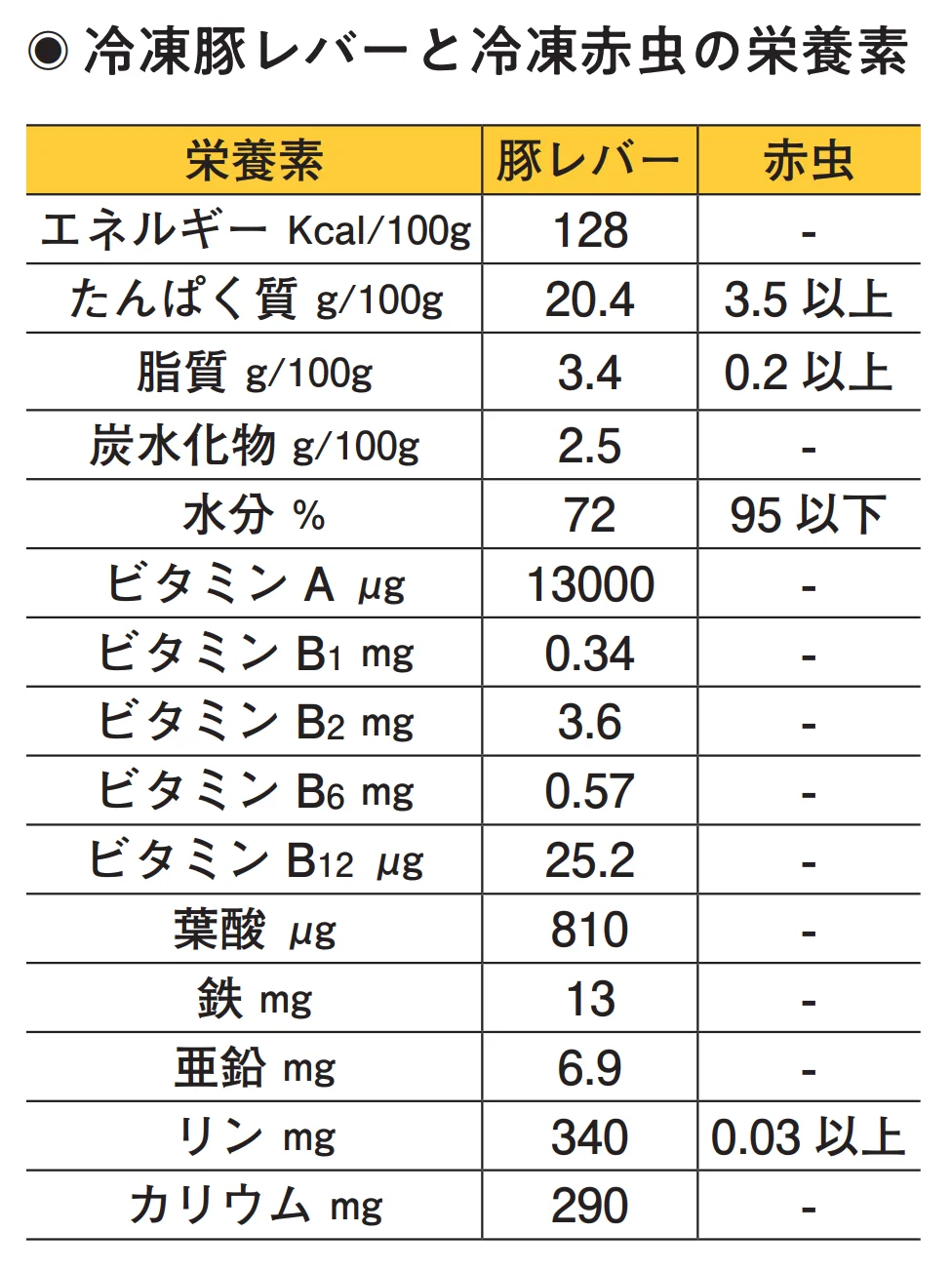 実験の結果は、左下のグラフの通りだ。赤虫群は1〜2月は個体数の変化が少なく、3月に入ってから少しずつ増加したが、最終的に17匹、18匹、21匹と微増レベルにとどまった。豚レバー群は2月初めまでほとんど変化がなかったが、その後は急に増え始め、3月に50匹を超えると最終的には60匹、67匹、67匹となった。赤虫群は体長12mm以上を保つ個体が多く、豚レバー群は8mm前後の小さい個体が多くなるのも特徴的だった。両群の増え方の違いは、エサに含まれる栄養素の違いと推測できるため、冷凍豚レバーと冷凍赤虫に含まれる栄養素も調べてみた。
