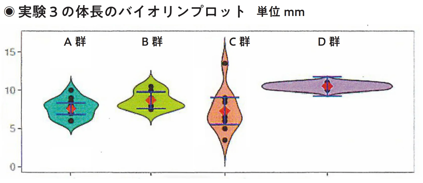 左から「赤虫→豚レバー」「豚レバー→赤虫」「豚レバーだけ」「赤虫だけ」のバイオリンプロット、中央の黒い点は実際に測った個体の体長データ、赤い菱形は平均値、青い線はデータのばらつき幅、左右に広がる曲線はその体長の個体数を表し横に広い部分ほどその長さの個体が多いことを示す