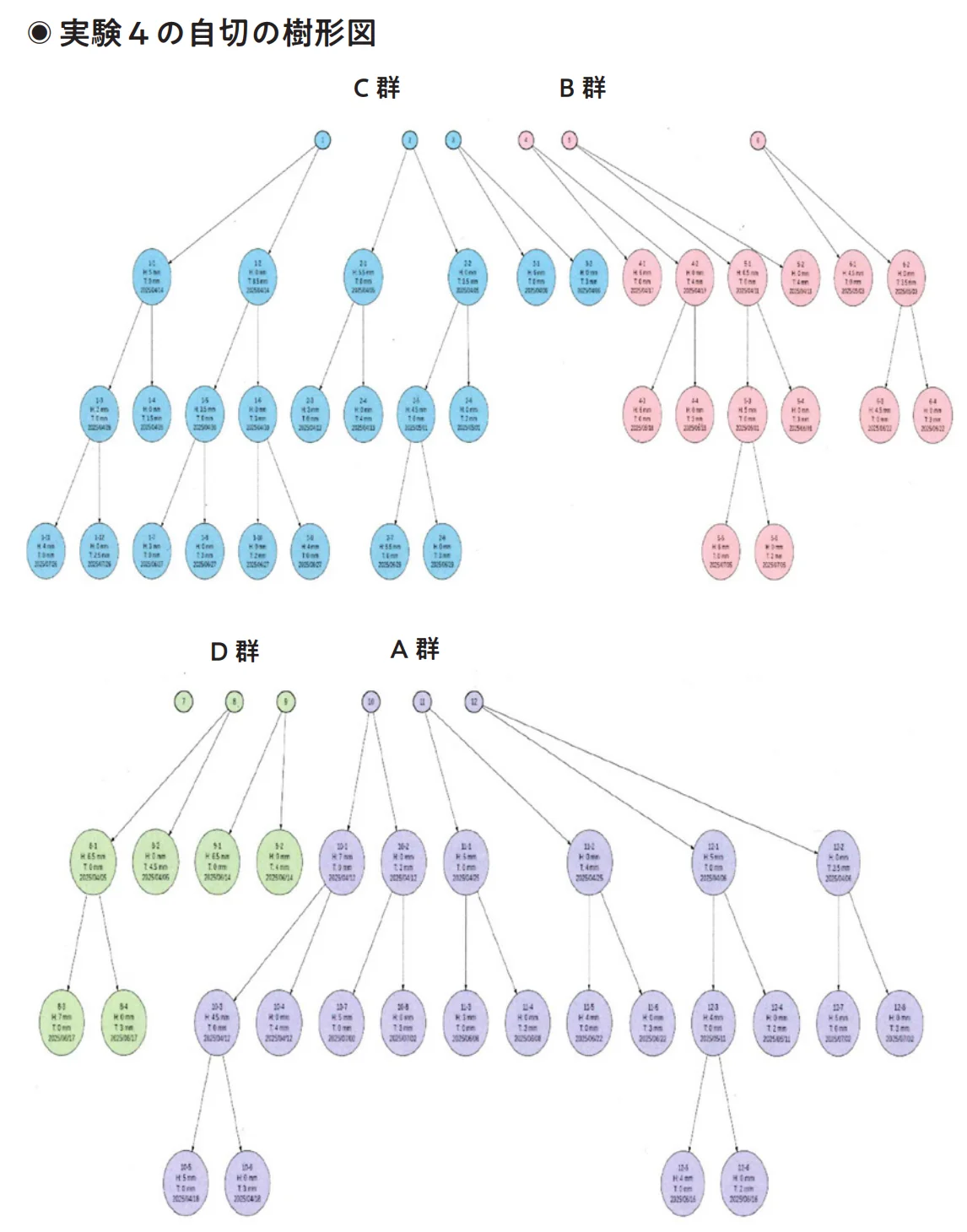 実験3のA〜D群からそれぞれ3匹ずつを選び、12穴プレートに1匹ずつ入れて、他の個体と接触しないようにしながら観察した。水はカルキ抜きした水道水を使い、毎日交換する。冷凍豚レバーと冷凍赤虫をエサにすることなどは、実験3と同じだ。2025年3月28日から7月28日まで毎日19時に観察し、自切が起こった日や回数、体長を記録する。最初の12匹の個体には、あらかじめ1〜12の番号を振った。例えば1番の豚レバーだけを与えていたプラナリアが自切した場合、2つの断片をあらかじめ用意した新しい12穴プレートに移して1-1、1-2と番号を振り、それぞれ同じエサ(この場合は豚レバー)を与えて同条件で観察を続けた。再生した1-1が自切した場合も2つの断片を違う穴に移し、1-3、1-4というように番号を振り、同条件で観察を続けた。