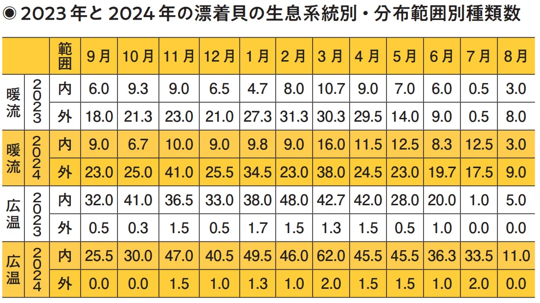 暖流系貝類と広温系貝類それぞれ、範囲内と範囲外でどれだけの種類を拾えていたのか、下の表にまとめた。2023年も2024年も暖流系貝類は、範囲内のほうがむしろ種類が少なかった。また、暖流系貝類は範囲内、範囲外ともに、2023年より2024年のほうが種類が多い傾向にあった。