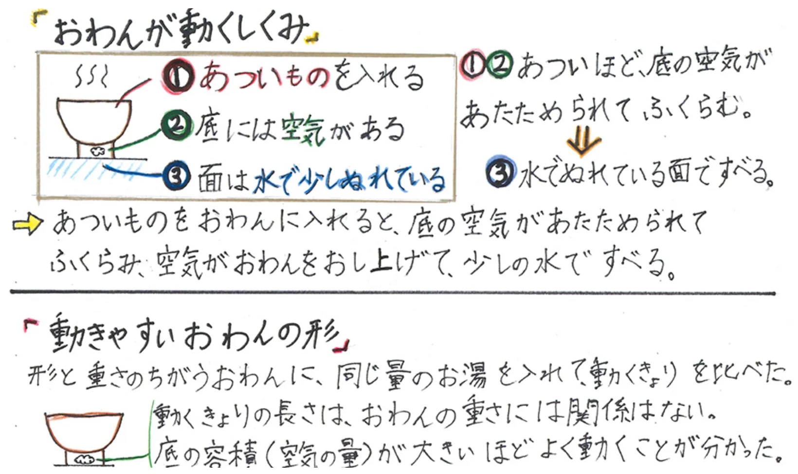 IHコンロ(磁力で発熱させる電気調理器)の上におわんを置いた時、おわんが勝手に動いたり止まったりする現象に不思議を感じたことによって、本研究は始まりました。数多くの実験や観測を行うことによって、その原因が、水がおわんの底の空気を閉じ込め、空気が膨らみ、おわんが少しだけ浮くことによって面を押す力が減少し、少しの傾きでも動くことを突き止めました。さらに、面にどんな液体をまくと滑りやすいかを調べ、氷水や砂糖水が動きやすいことも明らかにしています。