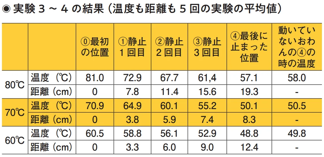 実験3ではおわんに80℃の湯を注いだ時、どう動くのかを観察した。トッププレートを霧吹きの水で20回ぬらし、おわんを置いて80℃の湯を80g注ぐ。おわんは動いては止まり動いては止まりをくり返すが、止まる度に最初の位置からの距離とその時の湯の温度を計る。別に、動かさないおわんも用意した。動くおわんと同時に80℃の湯を80gを注ぎ、動いたおわんが最後に動かなくなった時、動かないおわんの温度も計って比較した。この実験を5回行い、距離も温度も平均値を求めた。