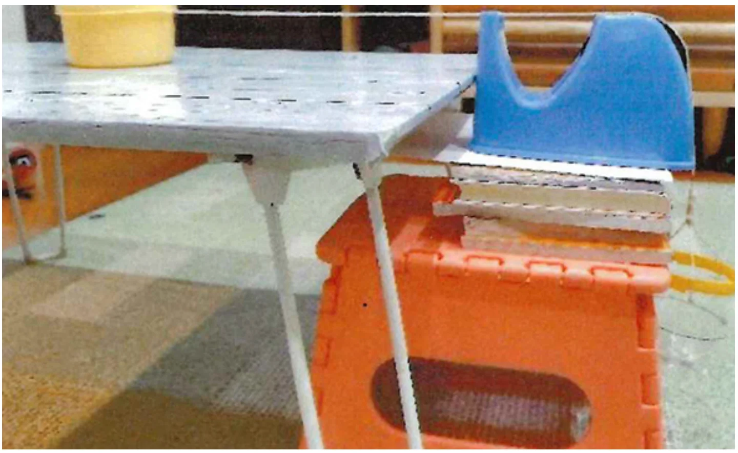 実験10は実験9の水の抵抗を、写真のような自作の実験道具を使って数字で表した。机に置いた重さ40gの保存容器と右下の容器をたこ糸でつなげる。テープ台の滑車を経てぶら下げた容器に1円玉をゆっくり1枚ずつ入れていき、何枚入れると保存容器が動くのかを観察した。保存容器を置いた机に霧ふきで30回、60回、100回と水を吹きかけ、それぞれおもりが何gなら保存容器が動くのかを確かめる。すると、30回は20g、60回は24g、100回は27gで動くことがわかった(台を水でぬらさない場合は15gで動いた)。