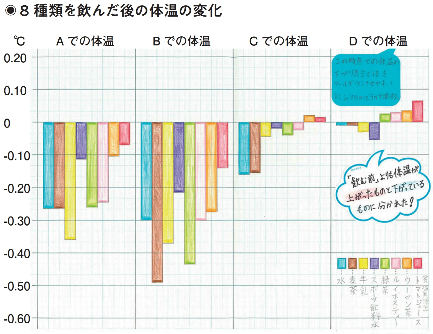 どの飲み物も飲んですぐに体温が下がり、特に2度目の100mlを飲んでから10分後のBで最も下がっている。が、時間が経過したDでは、実験前より逆に体温が上がった飲み物と、下げ幅は減るものの下がったままの飲み物に分かれた。Dの体温から元の体温を引いた値が低いほど、体をクールダウンさせる飲み物と定義した。